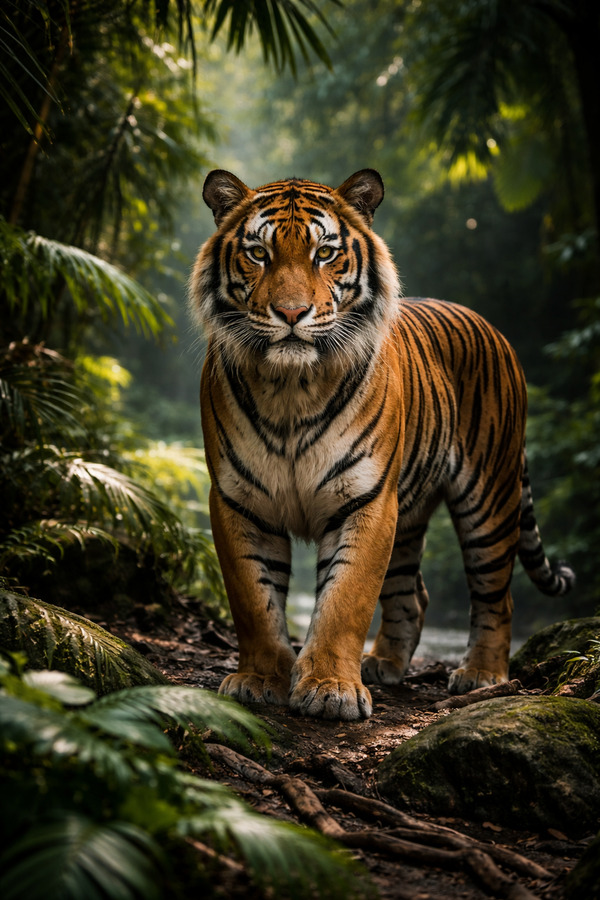 “A cinematic, close-up shot of a majestic Bengal tiger standing in a dense, misty tropical jungle…”